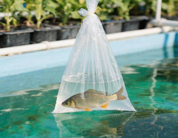 Transfert des poissons : Une fois le volume doublé et l'eau bien mélangée, retirez délicatement les poissons du sac/seau avec une épuisette à mailles fines. Ne versez jamais l'eau d'origine du transport dans votre bassin principal, car elle pourrait contenir des substances indésirables ou des agents pathogènes.
