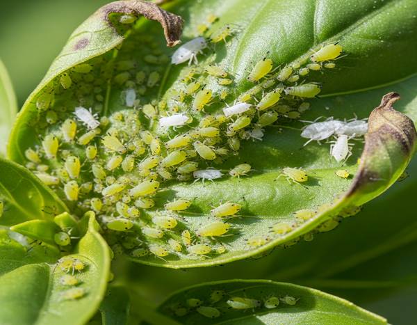 • Symptômes : Petits insectes verts, noirs ou jaunes, souvent regroupés sous les jeunes feuilles ou les tiges. Feuilles collantes (miellat).